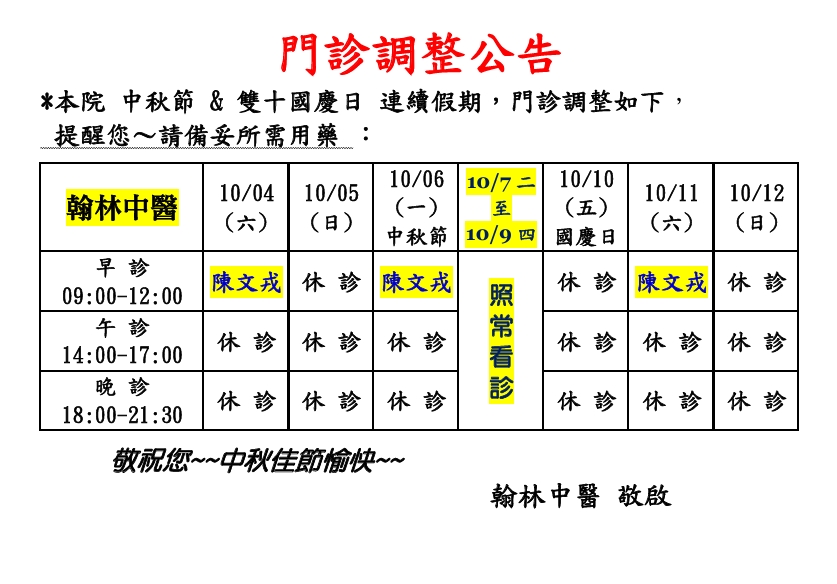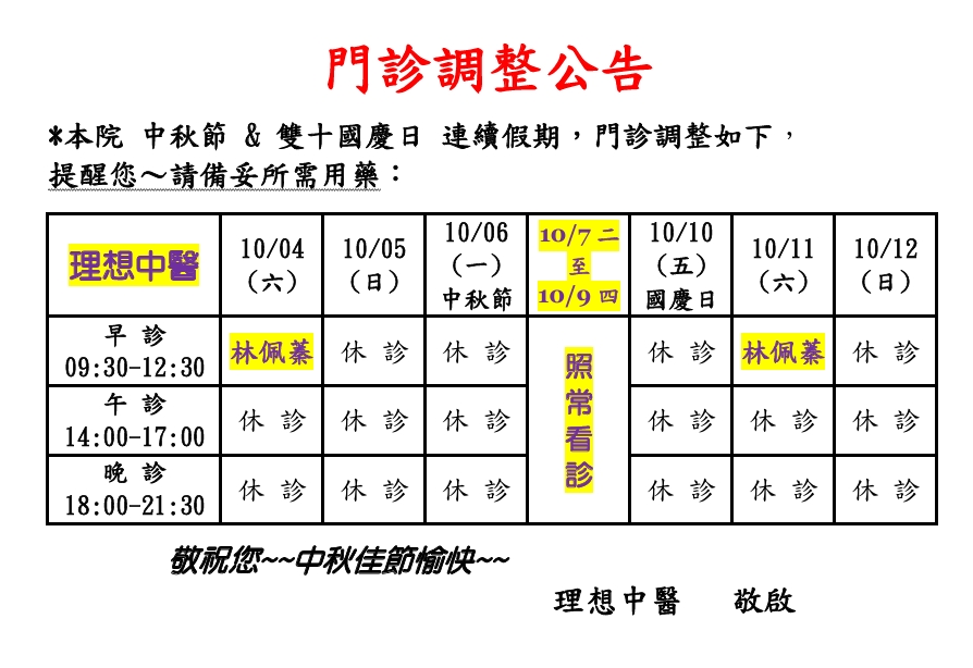 本院 中秋節 & 雙十國慶日 連續假期,門診調整 部分時段 門診 ~~